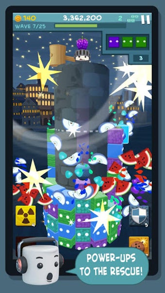 Hambrientos cubos de gelatina trepan hacia Marsh Mal, el héroe que defiende su columna como si la vida le fuera en ello. ¡Qué cosa más rara! Pero no hay tiempo para preguntas: para que los cubos estallen, y por lo tanto dejen de subir, debes lanzarles fruta del mismo color.